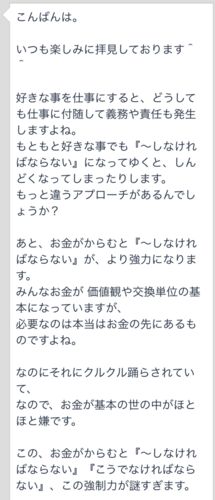 Q&Aキャンペーン 第2弾♪♪ 今日ももらった質問に答えていくよ。^^ 要約すると、 どれだけ好きなことでもお金を受け取ると、 義務や責任が生まれて、 「〜しなくちゃいけない」が強くなって しんどくなってしまう ってことかな。^^ うんうん、あるよね。 …